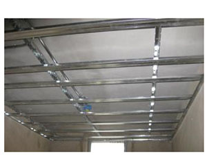 次龙骨的安装应该紧贴于主龙骨,间距一般是300—600mm,采用T形镀锌铁片连接件将次龙骨固定于主龙骨上,次龙骨两端要搭在L形边龙骨的水平翼缘上。